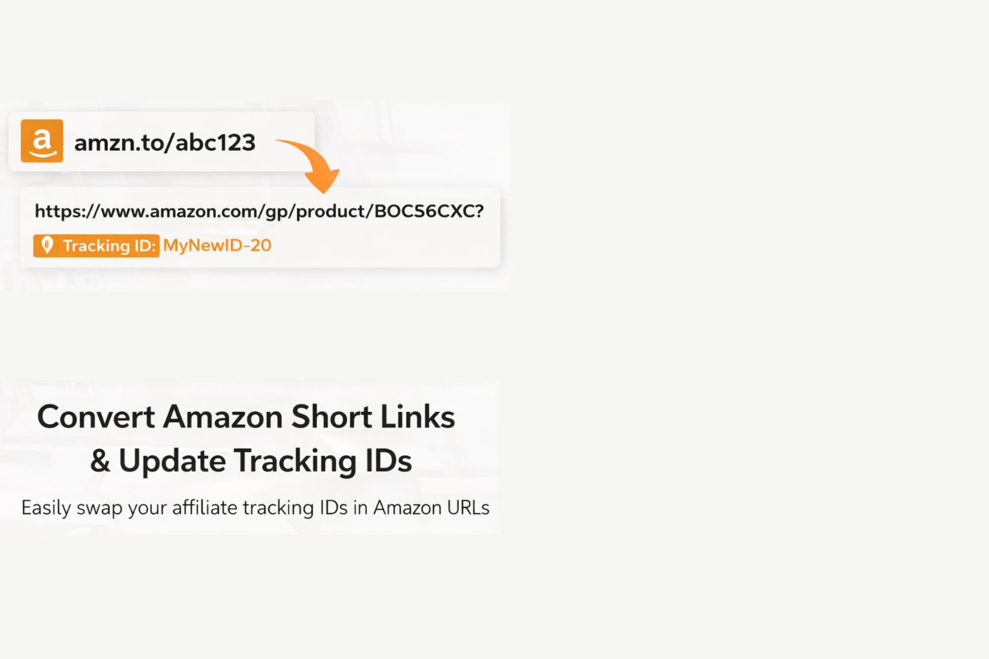 The Amazon affiliate tracking id replacer tool updates the tracking id in your Amazon Affiliate links. You can use it to replace your tracking ID in long URLs too, but it was really created to take an Amazon short link and return the long Amazon affiliate URL with the Tracking ID updated to your new affiliate tag.